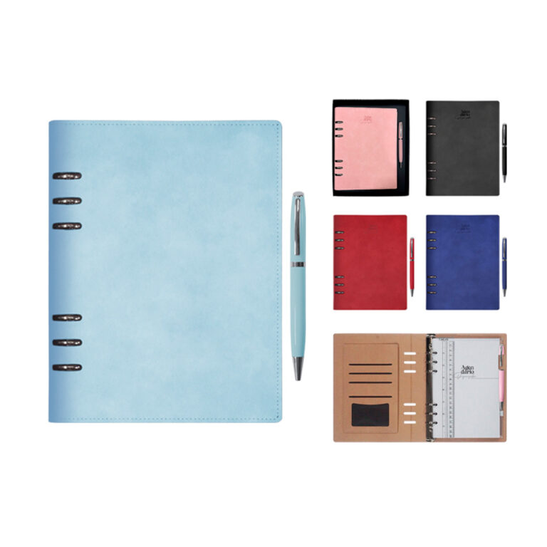 Carpeta tipo agendario organizador de pasta rígida de 6 arillos de metal. . Incluye: regla de 20 cm, bolsa de PVC con cierre a presión y bolígrafo de aluminio acabado brillante con detalles en cromo.