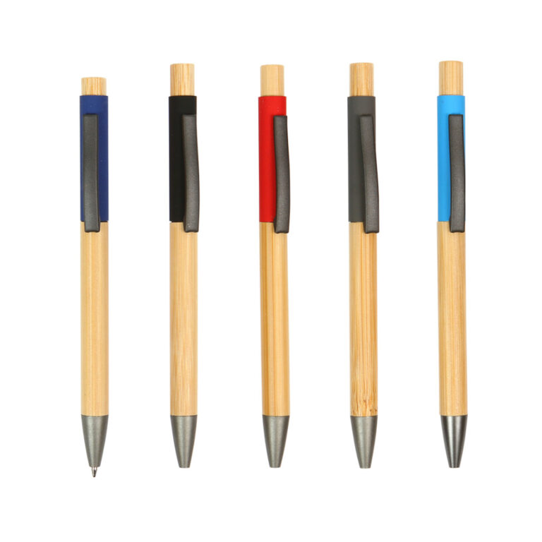 Bolígrafo con cuerpo fabricado en madera bambú, barril superior de aluminio y clip de plástico. Mecanismo de botón. Tinta de escritura negra.